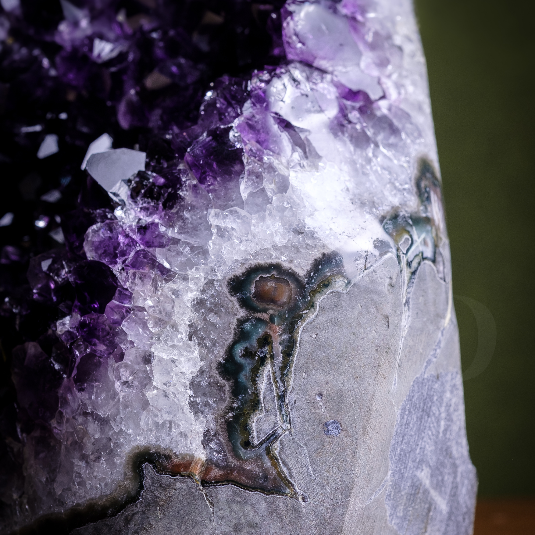 Discover Durab - this is an Amethyst with beautiful rich luxurious large purple teeth and shaped like a stable mountain. This Uruguayan amethyst aligns with the Earth element, offering stable flow of wealth, creativity, tranquillity and family harmony. Suitable for desktop placement.